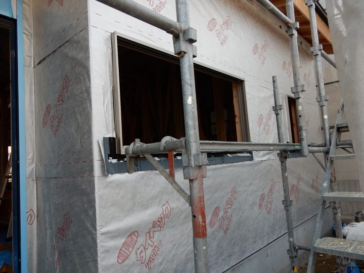 外壁まわりの耐力面材モイスTMの外側に、遮熱透湿防水シートのタイベックシルバー(デュポン社製)が張られました。