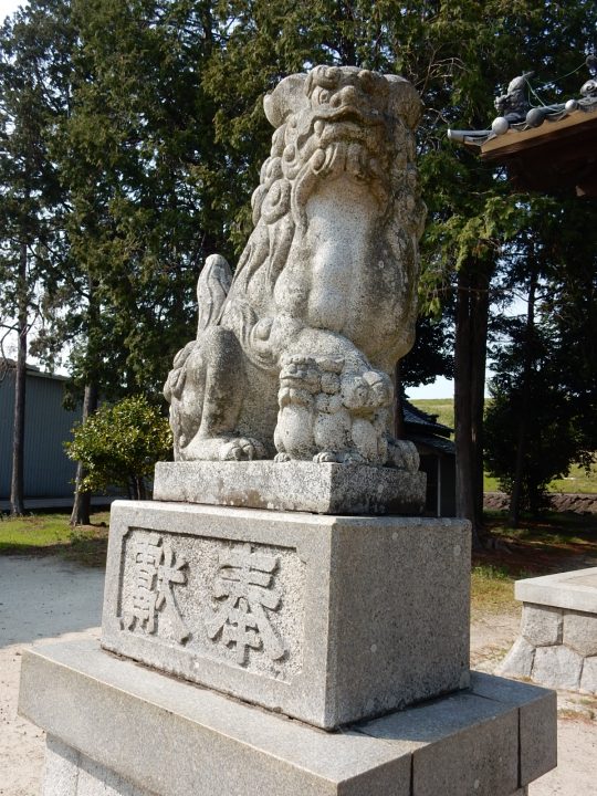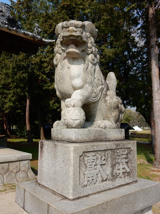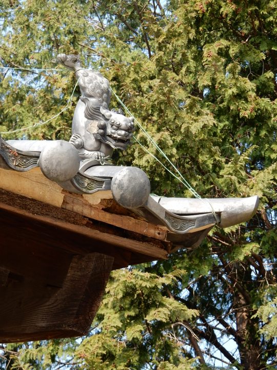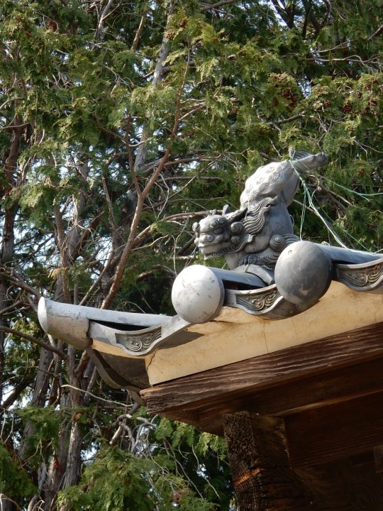 拝殿屋根の軒先の獅子巴蓋瓦。阿形。