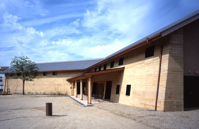 版築という、土を何層にも重ねて固めた工法で外壁が仕上げられています。