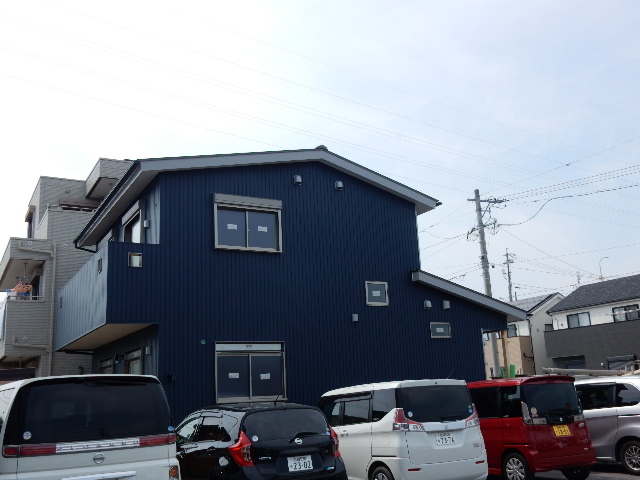 正面はグレーで他三面はダークブルーのガルバリウム鋼板角波の外壁張りです。