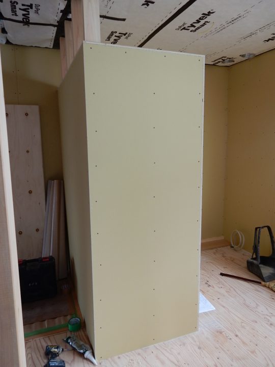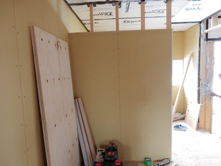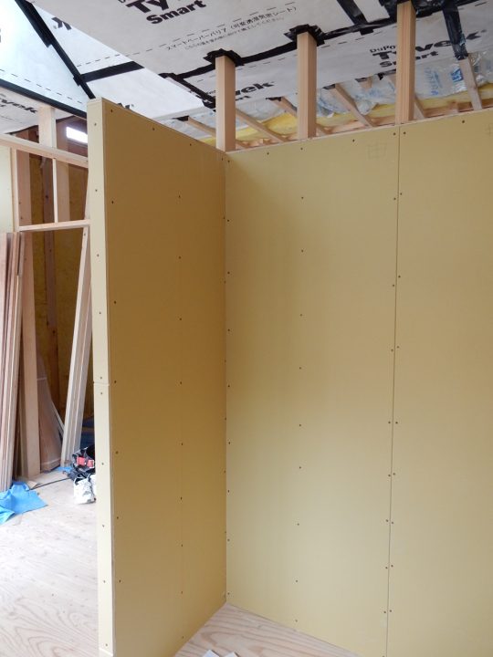 冷蔵庫はこの間仕切壁に耐震補強金具で固定する予定です。地震で冷蔵庫が揺らされると、間仕切壁にも大きな力が加わるので、その対策です。