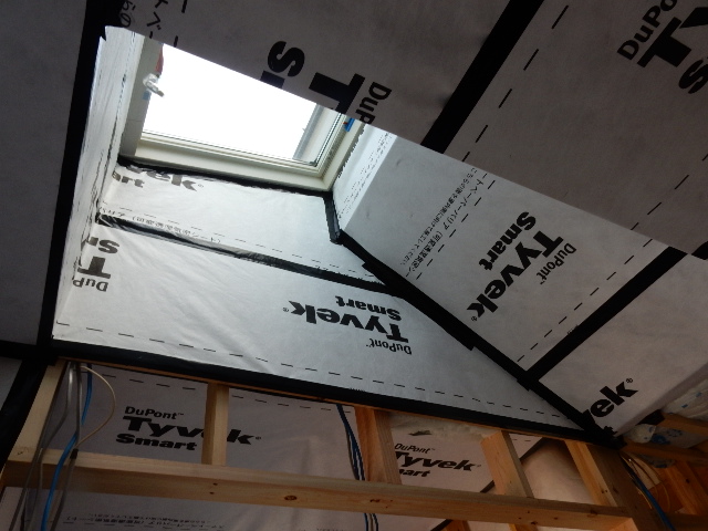 そこで、ダイニングに少しでも光が届くように、通常、天窓から天井までは煙突状に四角の囲いを垂直に立ち下げるだけのところを、そうせず、ダイニング側は、斜めに立ち下げたのです。