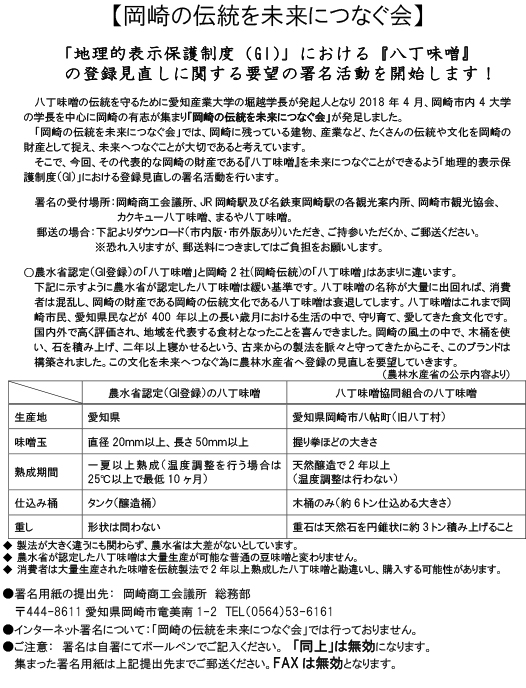 「岡崎の伝統を未来につなぐ会」による「地理的表示保護制度(GI)」における『八丁味噌』の登録見直しに関する要望の署名活動が開始されました。