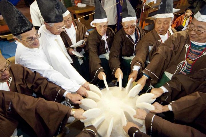 豊作を表す大鏡餅を鎌に見立てた小餅で刈り取り、牛の背に載せ蔵へ運び込んだのち、牛が重さに耐えきれず倒れる所作が特徴的です。