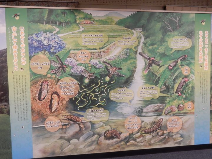 ホタルの一生がわかりやすいパネル展示。