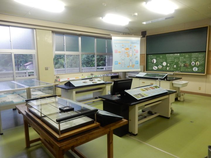 ホタル教室1。旧理科室であり、実験台や流し、黒板が残され、うまく展示に利用されています。