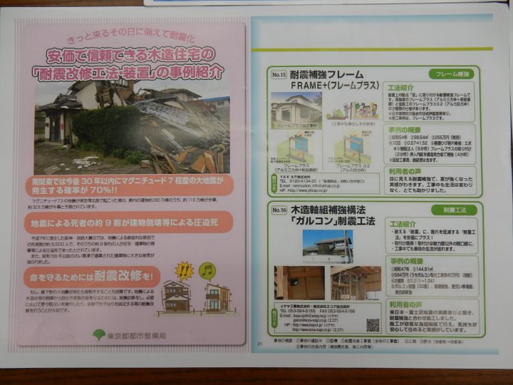 平成27年 東京都庁の「安価で信頼できる木造住宅の「耐震改修工法・装置」で承認され、事例紹介で、ガルコンが紹介されています。