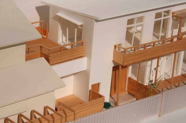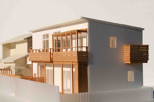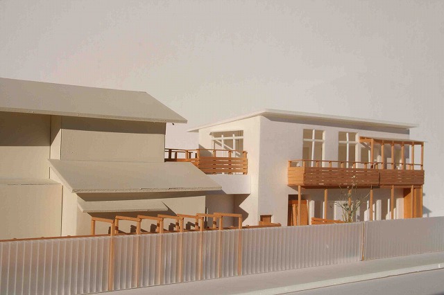 - 内部に梁を現し、外部にも手摺や塀に木を使いました。