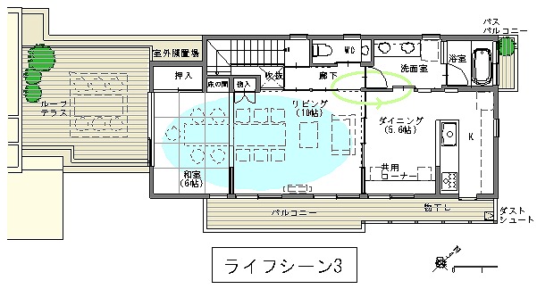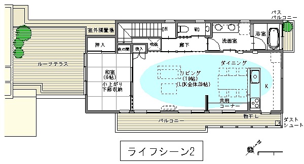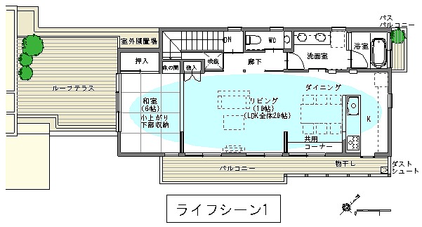 - LDKと一体になる続き和室を小上がりにし、ルーフテラスを設け
